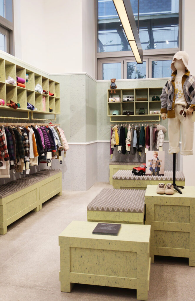전체 콘셉트는 런던에서 스코틀랜드로 향하는 기차 여행에서 영감을 받았다. 1층의 키즈 라인을 시작으로 각 층을 오를수록 계절의 변화와 시즌의 흐름을 체감할 수 있도록 설계됐다. 특히 품질 미달 재고를 활용한 업사이클링 공간과 AI 기반 디자인 공모전 수상작 전시를 통해 지속가능성과 미래형 디자인 비전을 동시에 보여준다.